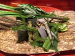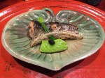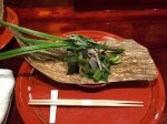 We started with the ayu (sweet fish) with taro and fava beans, with some other foraged items that we could not identify. This ayu was different in that it was like the adolescent ayu, caught higher upstream before they have a chance to grow to adult size, hence the softer the bones. Hidden inside the bamboo leaf that was wrapped with aromatic herbs was a piece of Sabazushi as they call it in Kyoto, Saba (mackerel) lightly pickled in rice vinegar. In the old days, before refrigeration, this is how the emperor’s sushi would survive transportation from the ocean. I am ruined with mackerel in the US, so stinky and fishy here, can’t trust it. This mackerel here was briny but almost fragrant and perfumed, maybe the vinegar?
