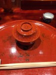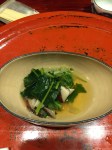 Then bonito fish marinated for one week, winter fern, and three types of Wasabi, and grilled carp with water shield. This was like eating an orchestra, strings, horns, percussion all going off at the same time, no solos. Each item was so novel to us, and the medley in this soup was inducing the paradox of choice, didn’t know what to eat first. Boiled raw Wasabi, wow, like boiled dandelion. Again, fresh Wasabi is not like the horseradish you get in the US, it’s delicate and sweet almost.