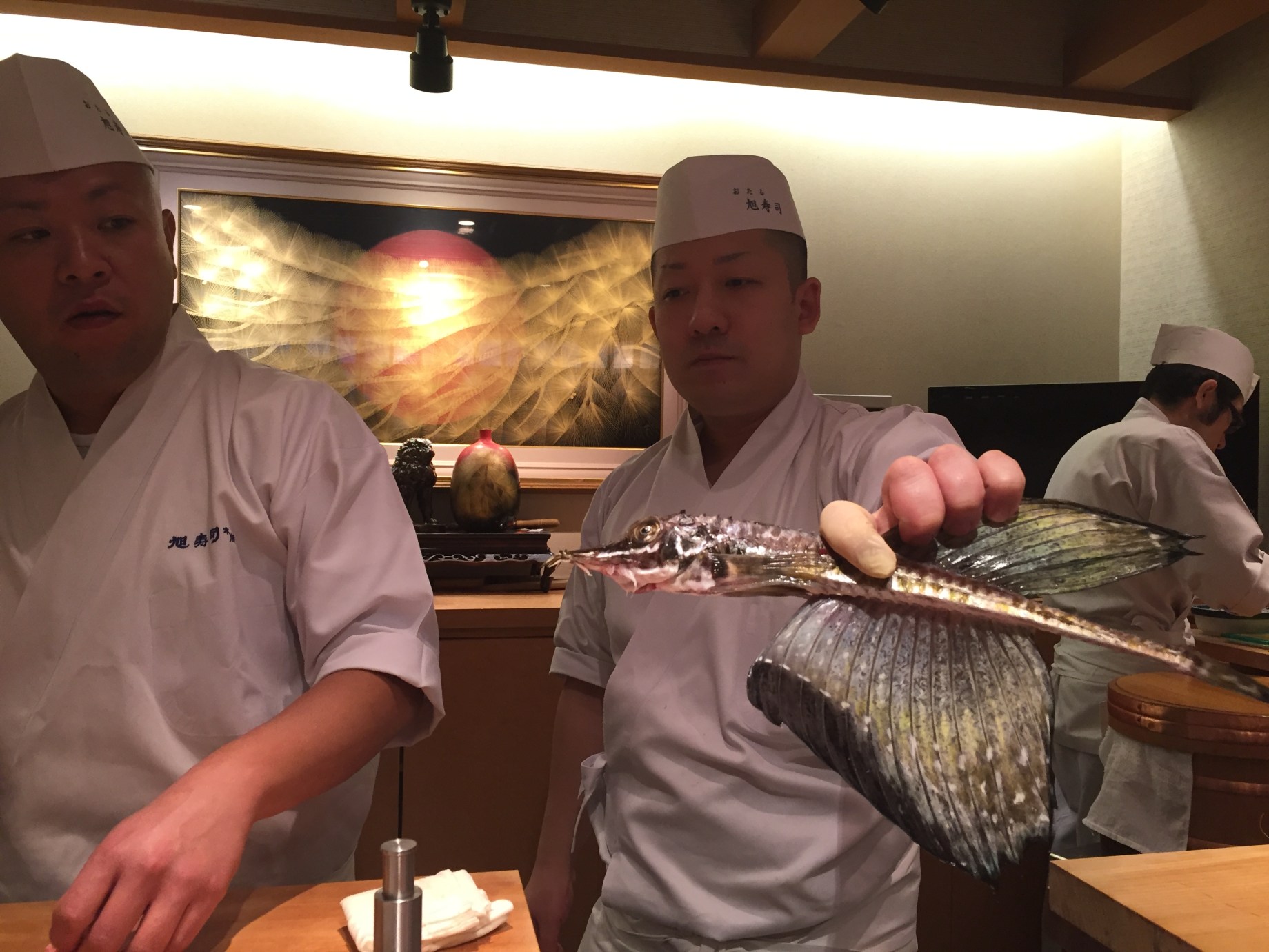 I’ve never seen a sushi chef afraid of the sushi he’s serving, look at the look on his face. Yet another special fish you can only find super fresh in Hokkaido, the sailfin poacher, aka dragonfish.